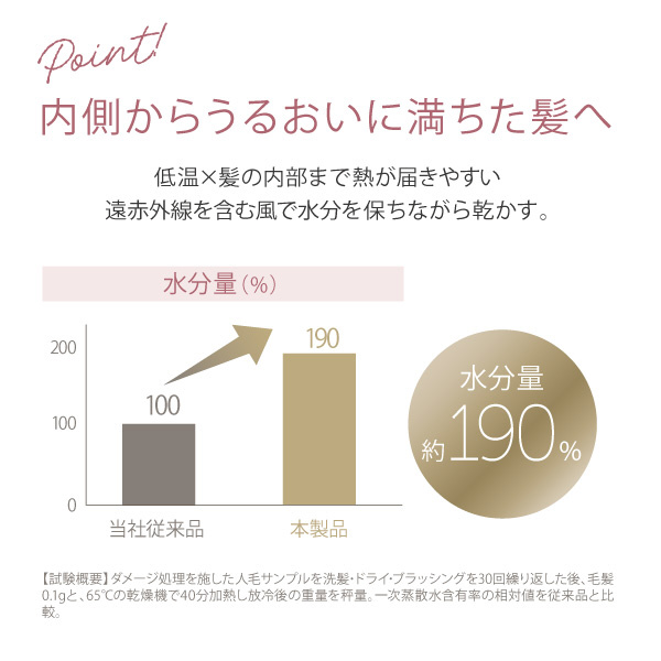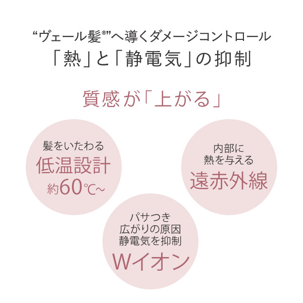 「環境センサー」により室温を感知し、風の温度が高くなり過ぎないようにコントロールする機能が搭載されました。温風の熱を低減することで、夏場でも快適に髪を乾かすことができます。また、過度な熱による髪のダメージを防ぐことで、うるおいを守りながら、なめらかで指通りの良い仕上がりに導きます。