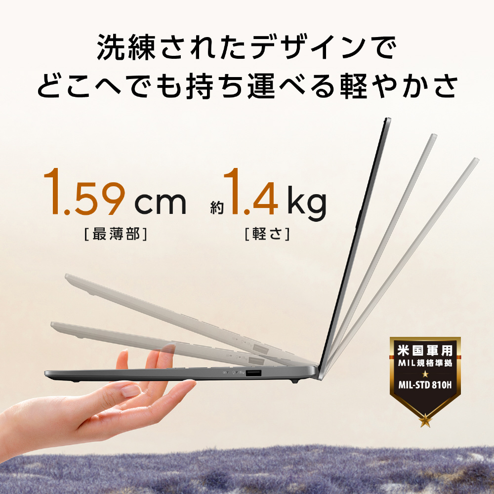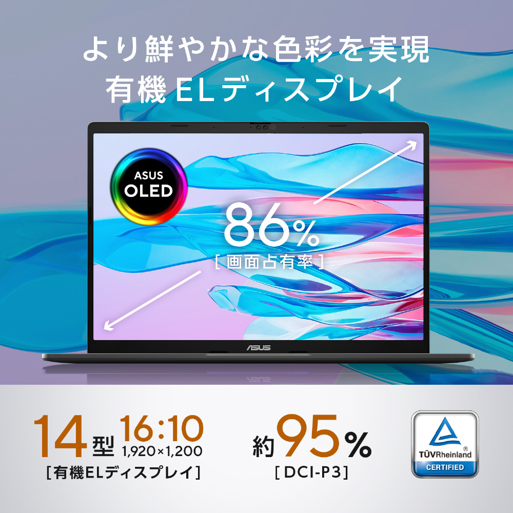 [ディスプレイ]14.0型、1920×1200ドット、DCI-P3:95%、グレア [電源]ACアダプターまたはリチウムポリマーバッテリー (4セル) [消費電力]最大約65W