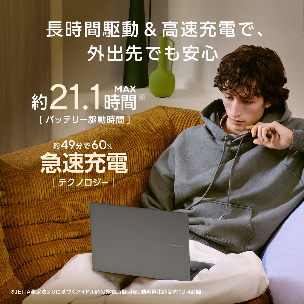 バッテリー駆動時間 (JEITA測定法3.0) ※:約13.4時間 (動画再生時) / 約21.1時間 (アイドル時) ※バッテリー駆動時間は、JEITAバッテリー動作時間測定法 (Ver3.0) に基付いたものです。また、使用状況や設定などにより変動します。