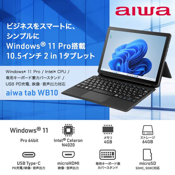 ノートパソコン aiwa tab WB10 JA4-TBW1002 [10.5型 /Windows11 Pro /intel Celeron /メモリ:4GB /eMMC:64GB /無し /日本語版キーボード /2025年1月モデル]