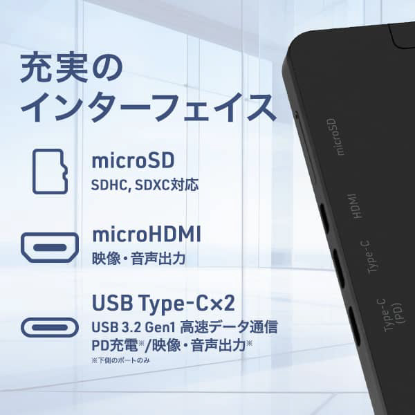 2つのUSB Type-CポートはどちらもUSB 3.2 Gen1仕様に対応しており、迅速なデータ転送を実現。特に下側のポートはPD充電にも対応しており、急な外出時にも付属の電源アダプターを使って素早く充電が可能です。さらにこのポートは映像・音声出力にも対応しているため、microHDMIと合わせて活用し、マルチモニター環境での作業効率を大幅に向上させます。