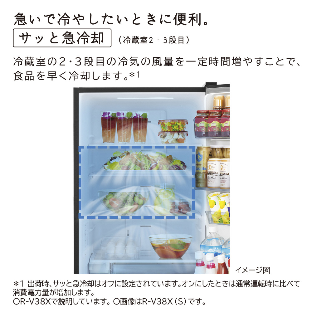 食品を急いで冷やしたいときに便利な急冷却機能。冷蔵室2・3段目の冷気の風量を一定時間増やすことで、食品を早く冷却します。