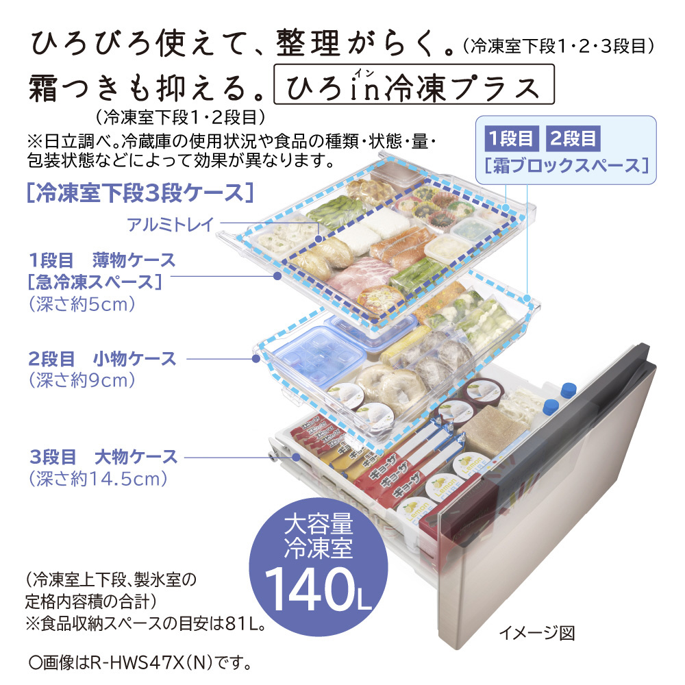 ひろびろ使えて整理がらく「ひろin冷凍プラス」。「まるごとチルド」「新鮮スリープ野菜室」搭載。スリムな本体幅60cmのシングルドア470Lタイプ