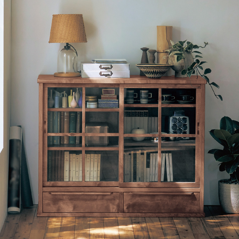 ・ガラス戸のみと引出し付きの2タイプ。サイズはそれぞれ幅80cmと幅110cmをご用意。同サイズをスタッキングすれば、省スペースで収納力がアップ。引出し付きのC・Dタイプを上にスタッキングすることも可能です。単体は高さ90cmなので、天板をディスプレイ棚としても◎