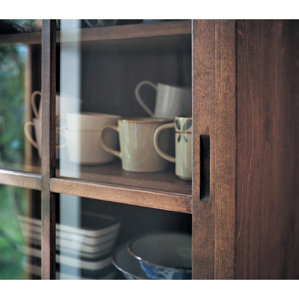 ・全面がガラスの引戸は、できるだけ桟を細くして、中のものが見えやすいように工夫しました。お気に入りの食器を飾ったり、コレクションをディスプレイしたり、ショーケースとしても使えます。