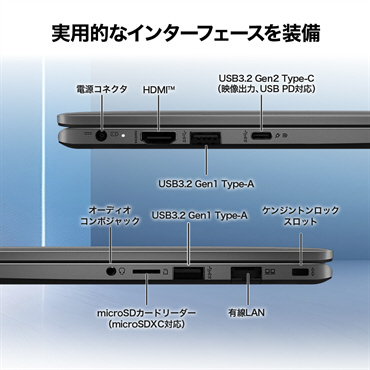 有線LAN 1Gbps ×1、microSDカードリーダー(microSDXC対応) ×1、USB3.2 Gen2 Type-C(映像出力、USB PD対応)×1、USB3.2 Gen1 Type-A ×2、HDMI ×1、オーディオコンボジャック ×1