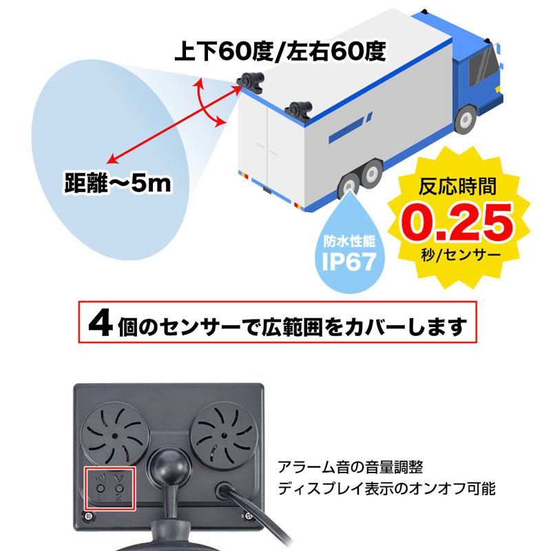セーフティセンサーは標準で4個のセンサーが付属しており、モニターに対象物までの距離を表示。