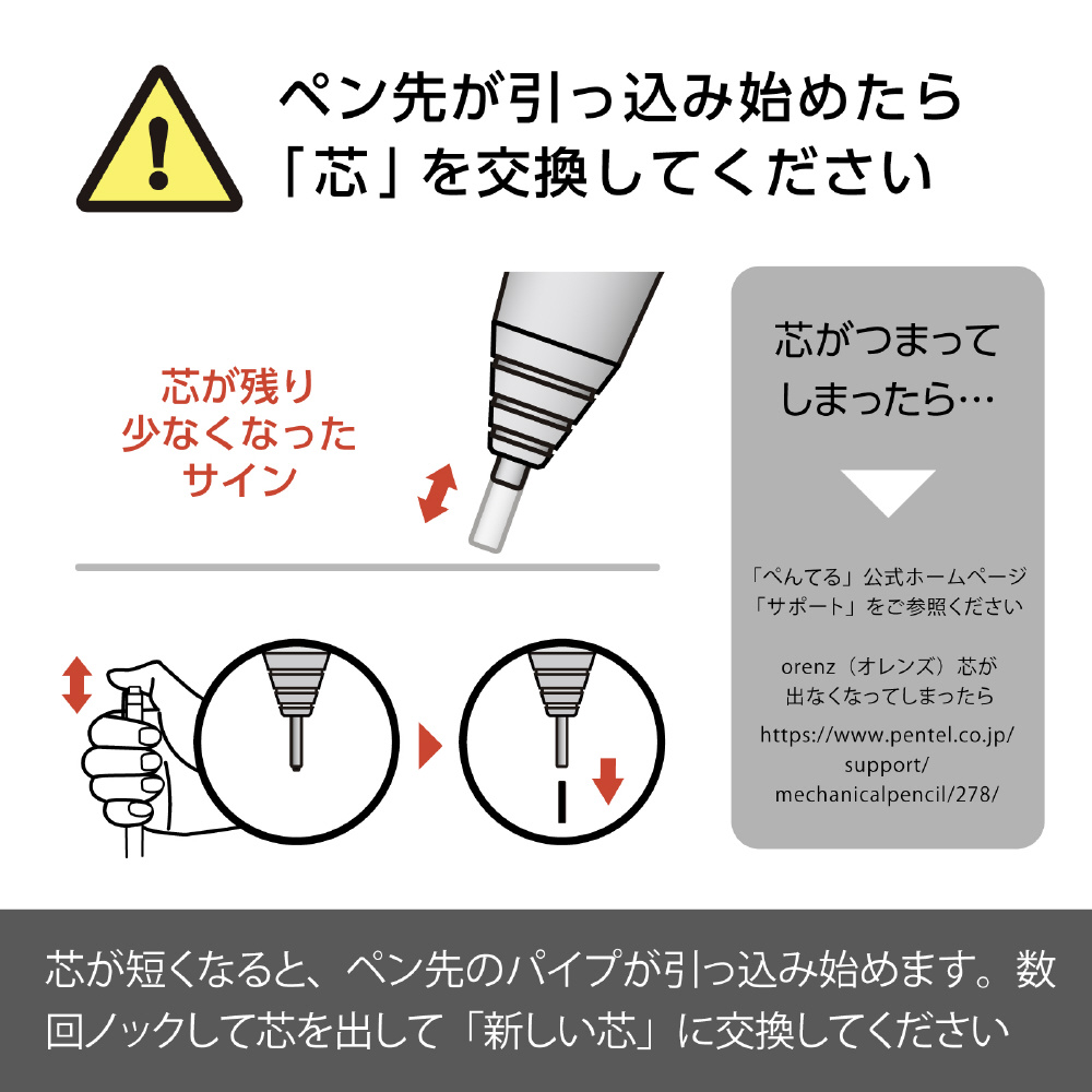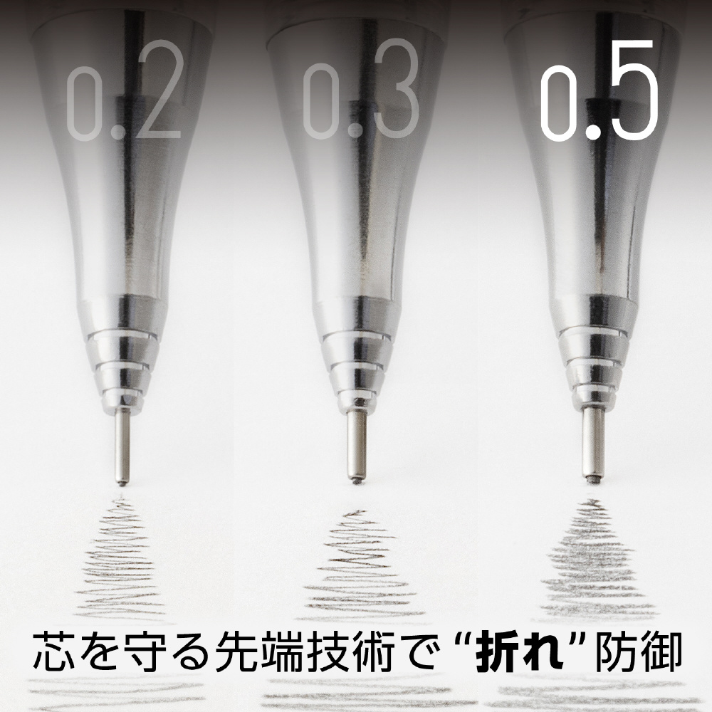 オレンズ メタルグリップは、ペン先が収納されている状態から、1回ノックするだけで筆記可能。1秒を争う試験の時や、ふと思いついたアイデアをすばやくメモしたい時に活躍するシャープペンシルです。メタルグリップにはブロック状のローレットを採用。ブロックが面で指を支えるので、長時間使用しても痛くなりにくいです。よりなめらかに、より濃く書けるB芯を内蔵。プラスチックを大幅に減らした紙製ブリスター入り。(リニューアル前製品から81.8%減・2025年8月リニューアル)