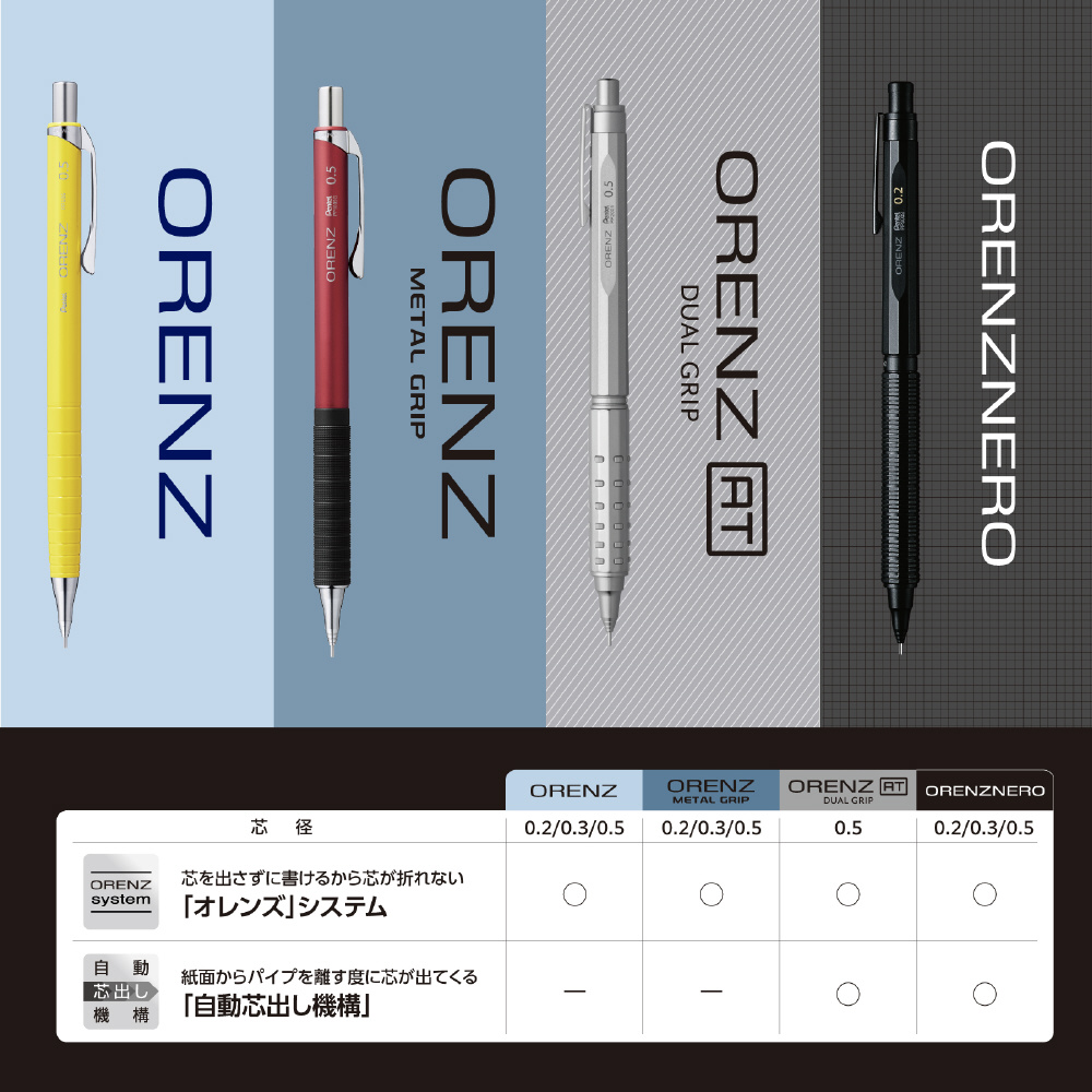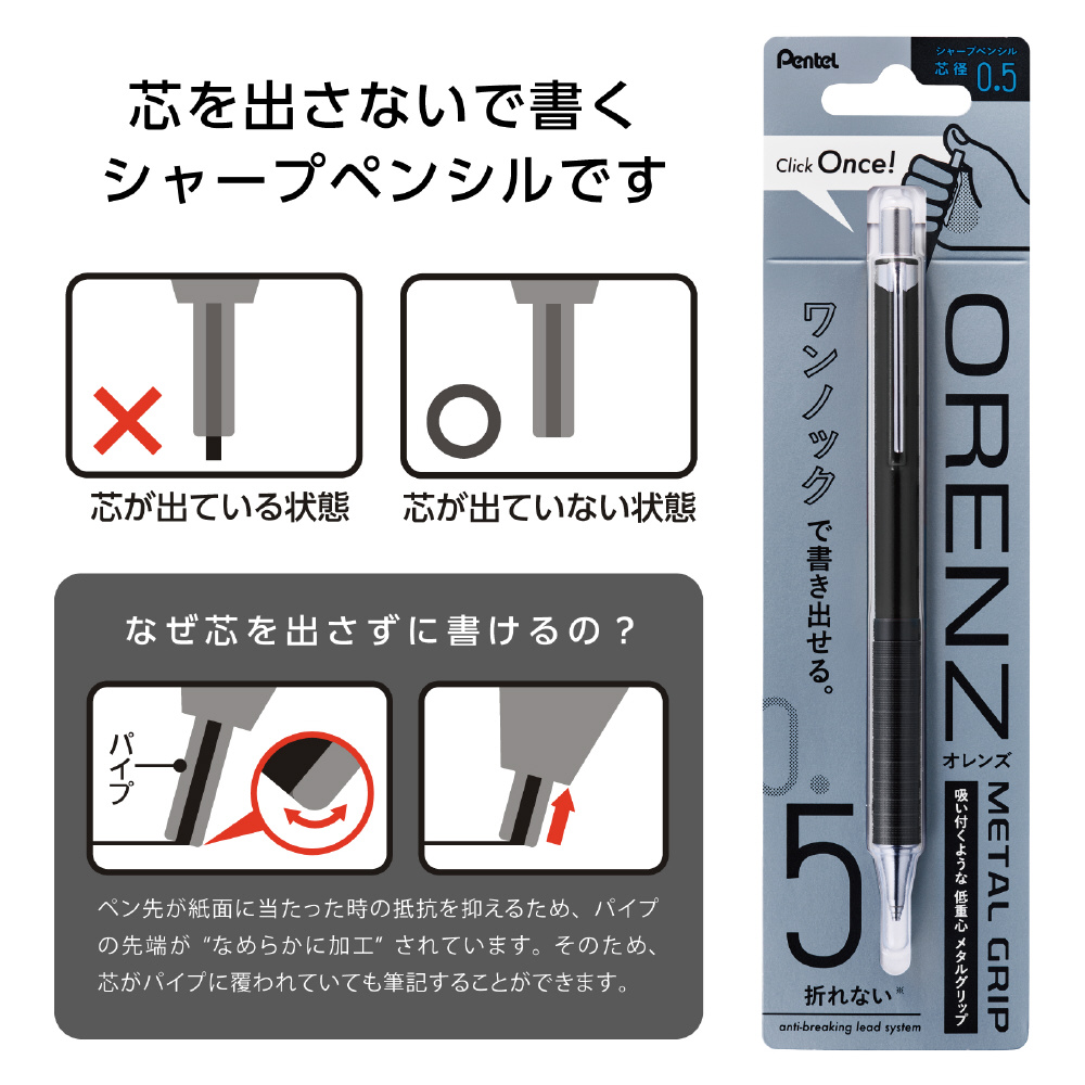 オレンズは、芯を守りながら書く不思議なシャープペンシルです。極細の芯でも折れずに、1回ノックするだけで筆記可能。1秒を争う試験の時や、ふと思いついたアイデアをすばやくメモしたい時に活躍するシャープペンシルです。メタルグリップにはブロック状のローレットを採用。プラスチックを大幅に減らした紙製ブリスター入り。(リニューアル前製品から75%減・2025年8月リニューアル)