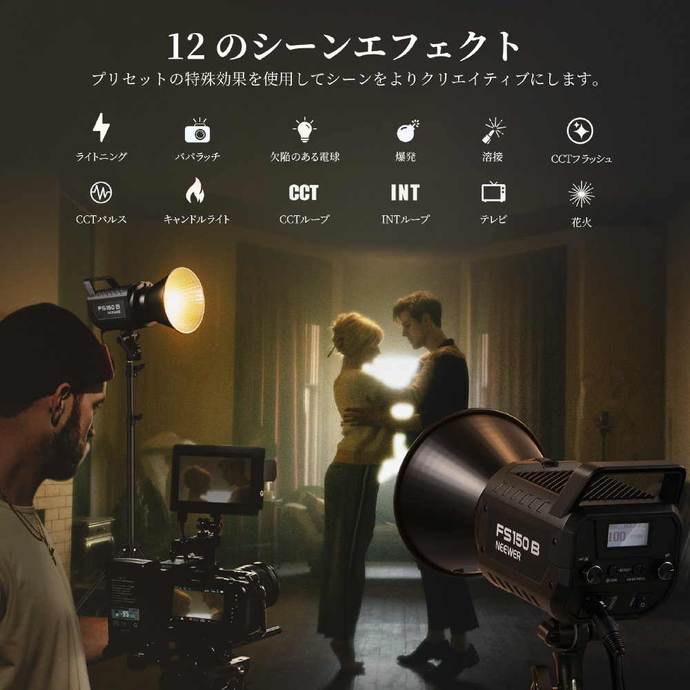 明るさレベル 0 〜 1.00% まで 1.% 刻みで正確に調整可能。4. つの調光パターン (指数関数、対数、S、線形) より、正確な照明調整に。高い CRI 9.7.+ および TLCI 9.8.+ は忠実な演色性を保証します。2..7.00K〜6.5.00K の広大な色温度範囲により、温かみのある照明と冷感照明を提供し、1.2..種類の特殊効果でビデオ 独特な制作を可能にします