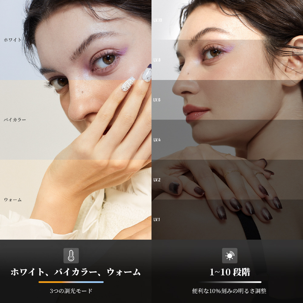 60個の高品質LEDを搭載、0.5mの距離で250luxの照度とCRI95の高演色性を実現。肌を自然に明るく照らし、顔のシミを目立たせず美しくします。