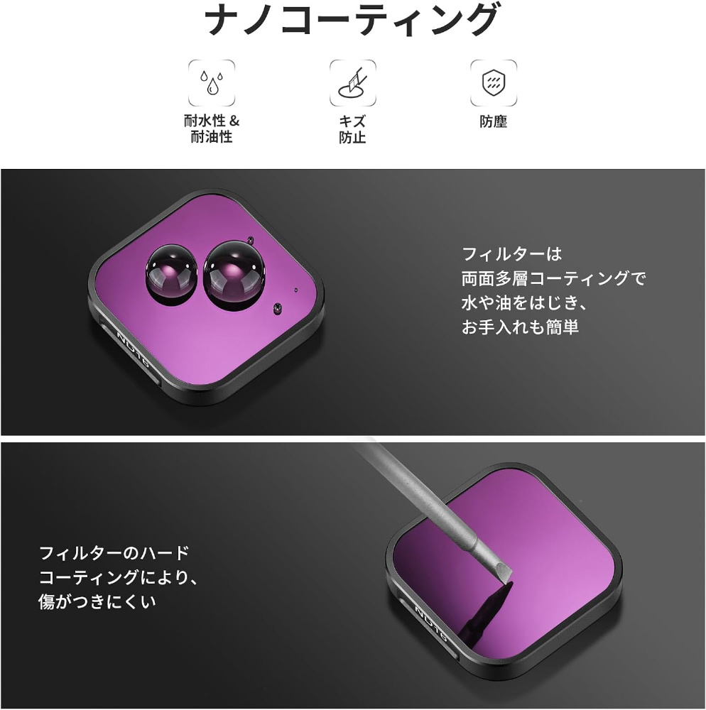 これらのフィルターは、2..8.層ナノコーティングで保護されて、防水性、耐傷性、耐油性、指紋防止機能を備えています。ご注意:ガラス表面のみが防水です。フィルター全体を水中で使用することはできません。