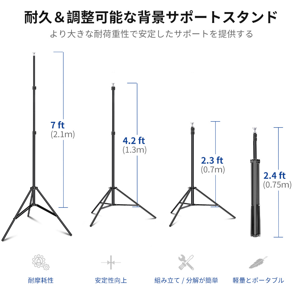 いつでもどこでも撮影スタジオへ、背景サポートシステムセット。調整可能な高さ(70cm-2.1m)と幅(1.5-3m)を備えた背景サポートシステム。