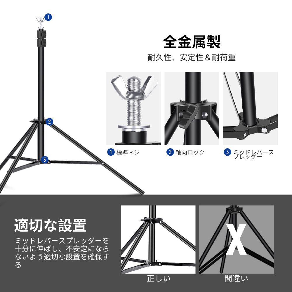 2つの背景スタンド、4つのクロスバー、およびその他のアクセサリが付属しており、背景 を安定してサポートします。写真スタジオ、パーティー、結婚式、その他のイベントに最適です。
