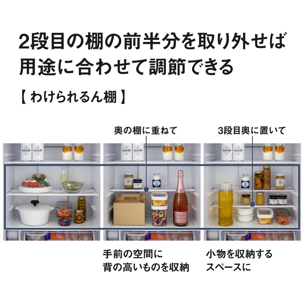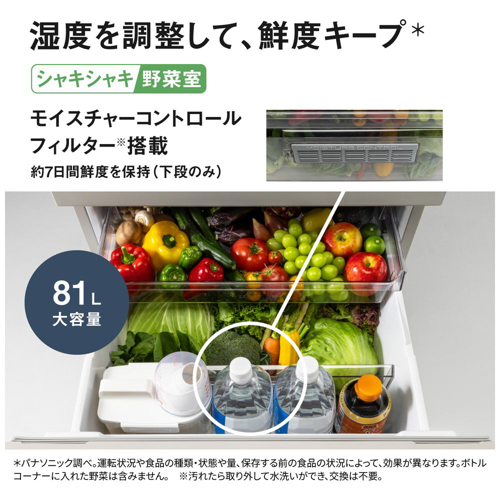 全棚ガラストレイ(冷蔵室のみ)、野菜室真ん中タイプ、奥まで見えるフルオープン(野菜室のみ)、AIエコナビ(かしこく)、ナノイーX(冷蔵室)