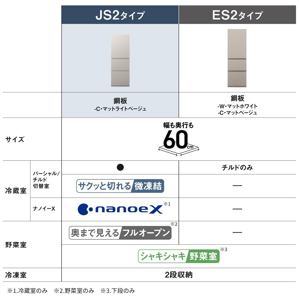仕様2 全棚ガラストレイ(冷蔵室のみ)、野菜室真ん中タイプ、奥まで見えるフルオープン(野菜室のみ)、AIエコナビ(かしこく)、ナノイーX(冷蔵室)