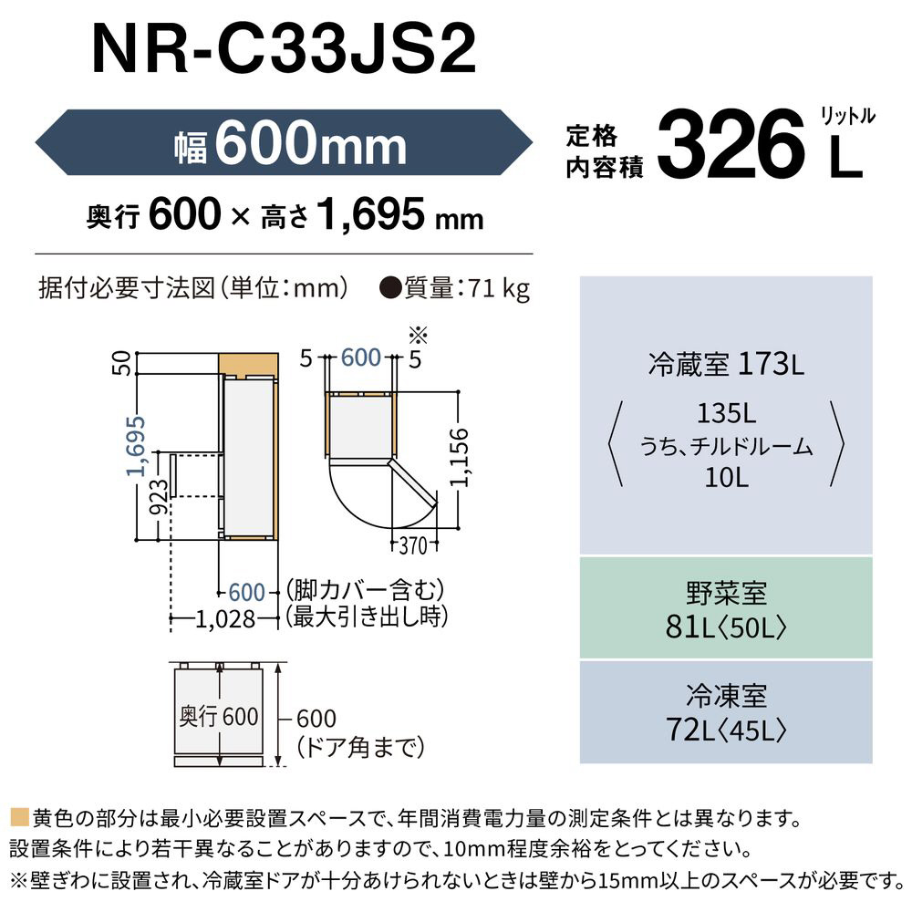 冷蔵庫 JSタイプ マットライトベージュ NR-C33JS2L-C [幅60cm /326L /3ドア /左開きタイプ /2025年]