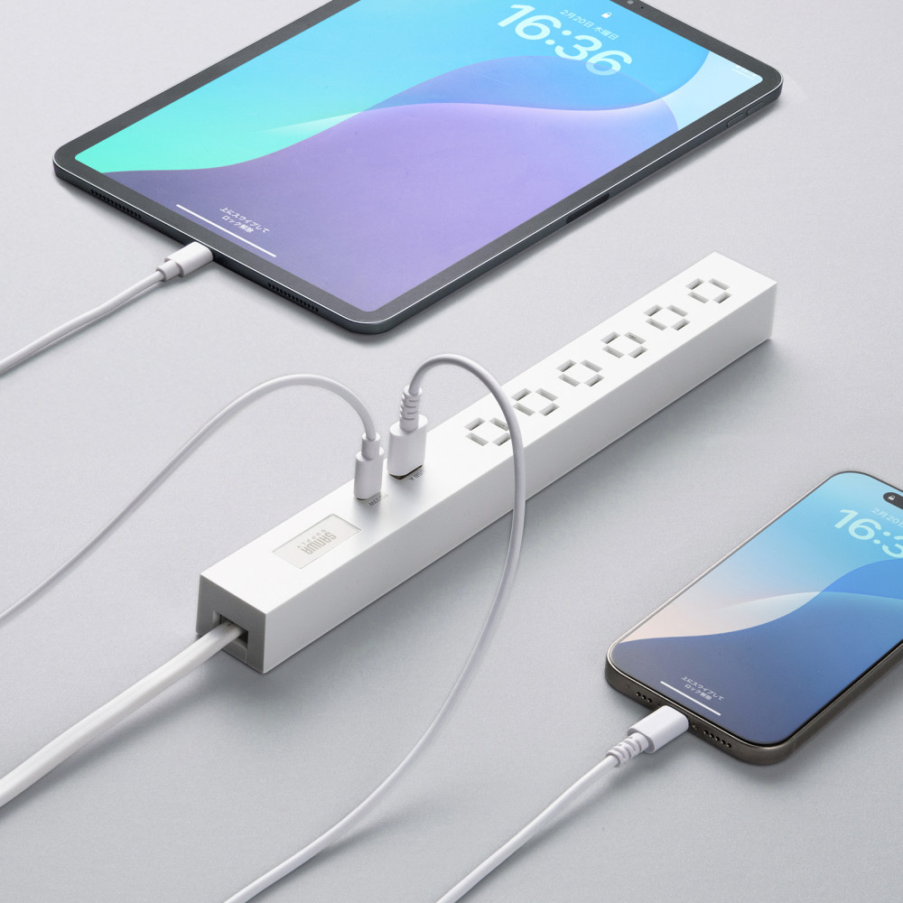 縦横間自在に差し込めるユニークな6個口設計。USBPD充電機能搭載で、スマートに電源を確保できます。