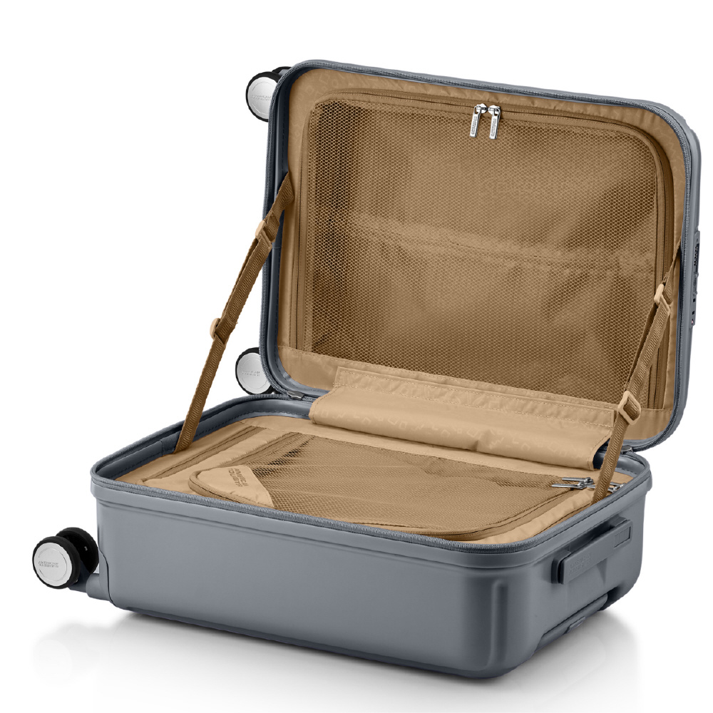 内装はブックオープン型で、仕切りパネルとクロスストラップを備え、荷崩れを防ぎながらすっきりとパッキング可能。