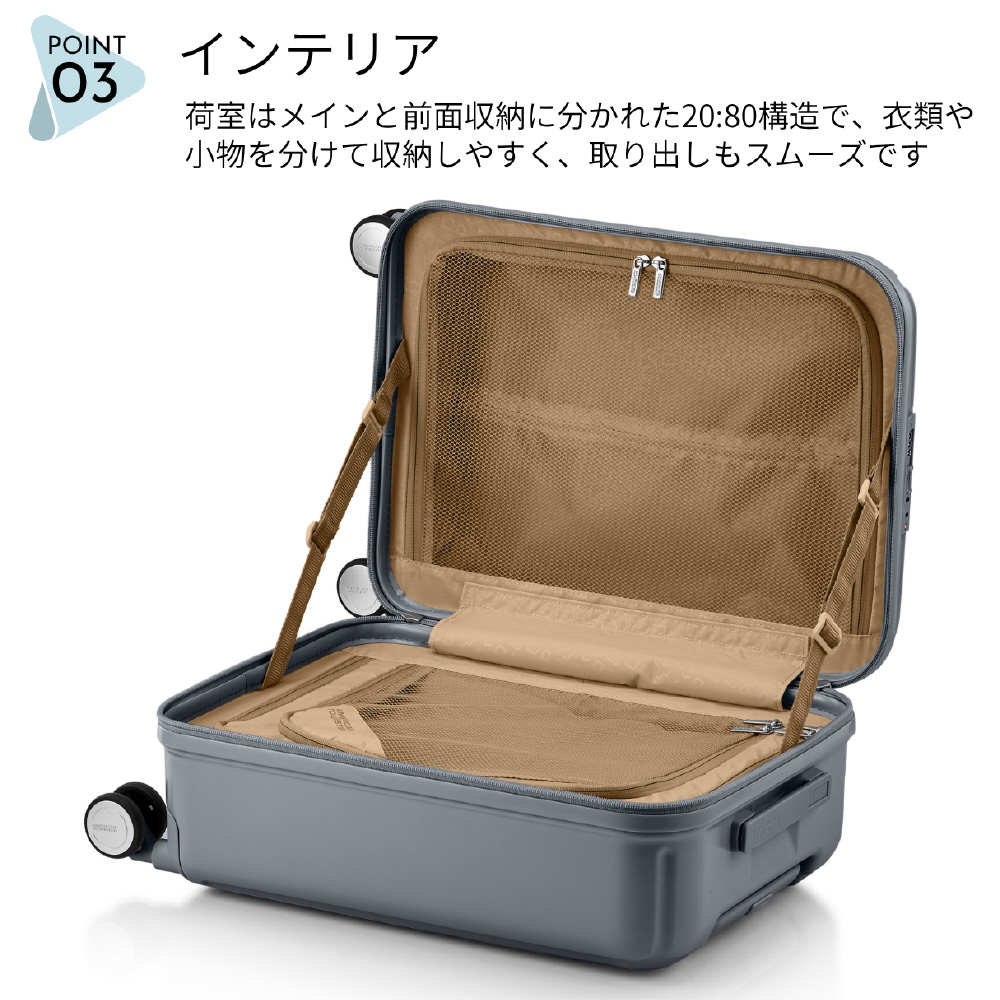 セキュリティ面では、こじ開けに強い二重構造のDUOSAF(TM)セキュリティジッパーと、鍵不要で空港検査にも対応するTSAロックを採用。安心して荷物を預けられます。