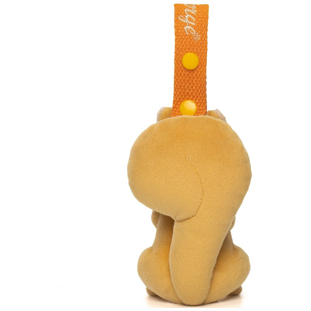 ぬいぐるみマスコットに刺繍ロゴ入りの色違いストラップを付けています。