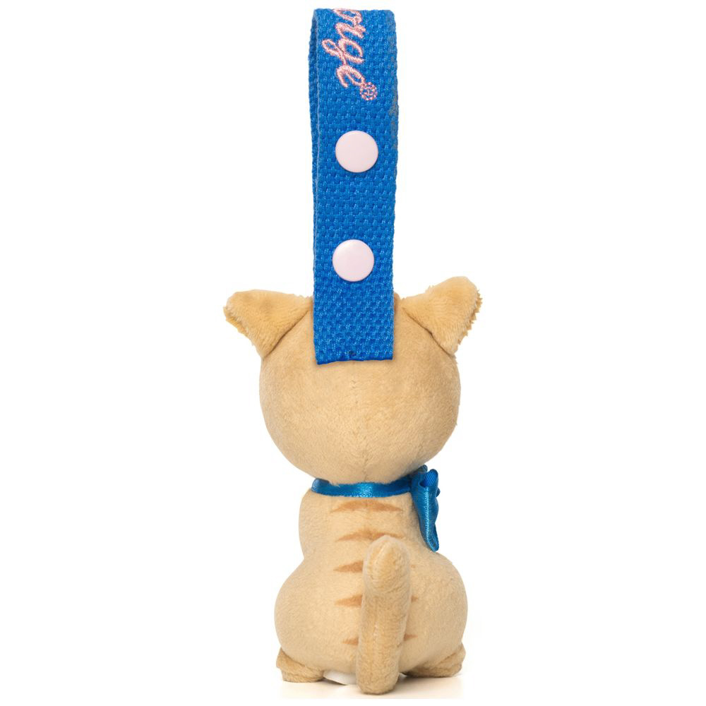 ぬいぐるみマスコットに刺繍ロゴ入りの色違いストラップを付けています。