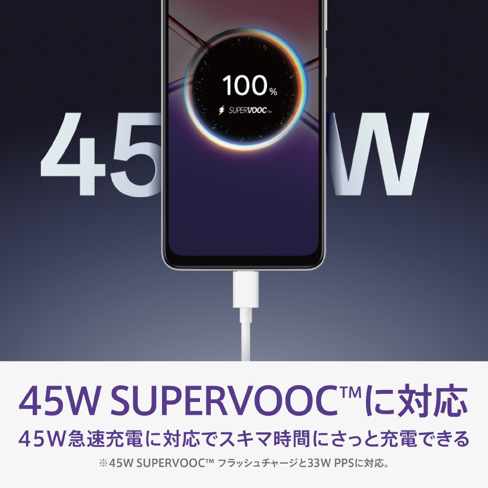 ※充電器の使用に関する注意事項は安全ガイドをご覧ください。充電器は別売りです。急速充電には対応充電器が必要です。急速充電対応充電器はOPPO公式オンラインショップで購入できます。