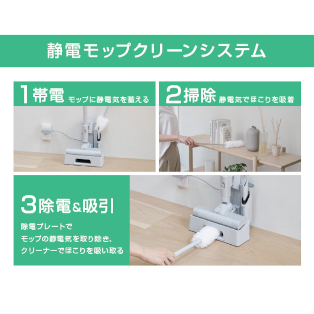 充電アダプター、充電スタンド、静電モップ、モップ帯電ケース、すき間ノズル、使い捨てダストパック×50枚(1枚本体内にセット済み)