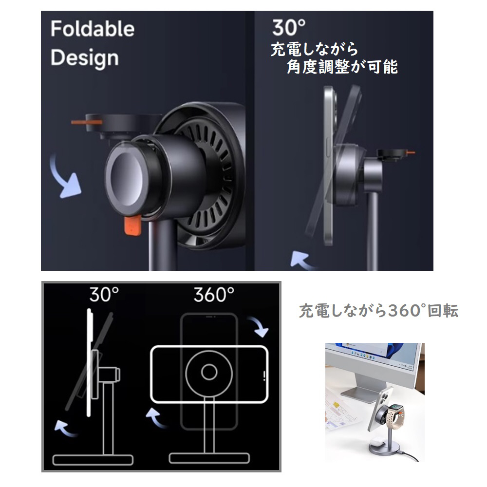 スタイリッシュなスタンド型。スマートフォンは充電中に回転できるギミック搭載。デスクワークが