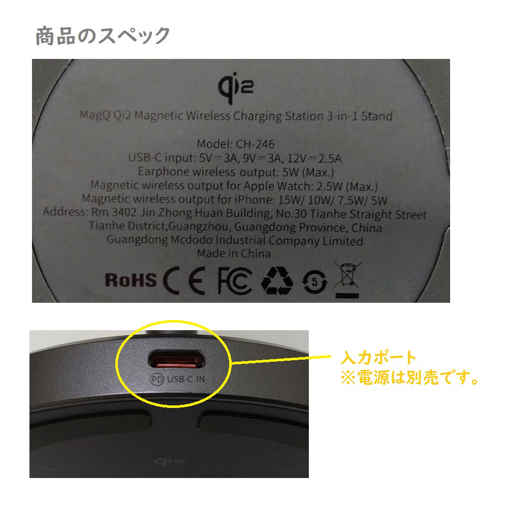 出力:Applewatch用: 2.5w(最大) IPhone:15w/10w/7.5w/5.0w(最大) イヤホン用: 5.0w(最大)