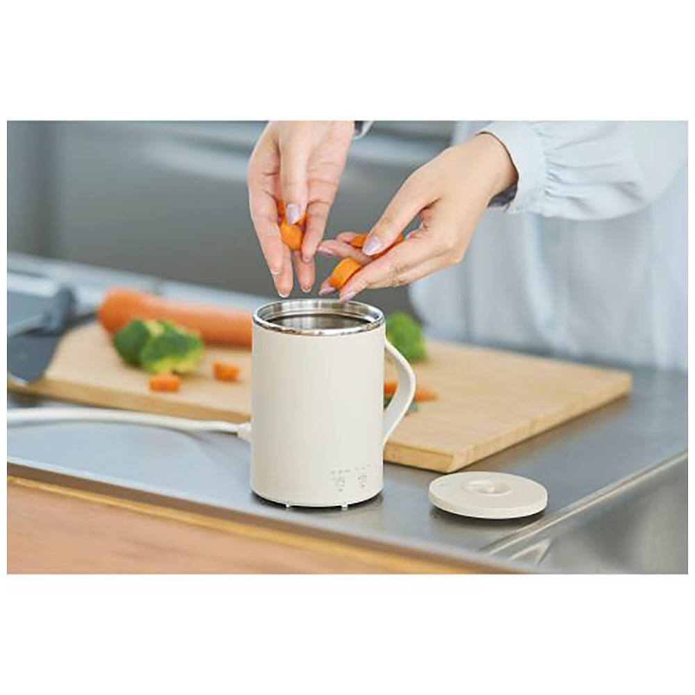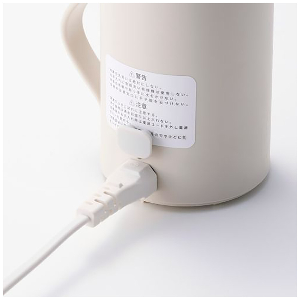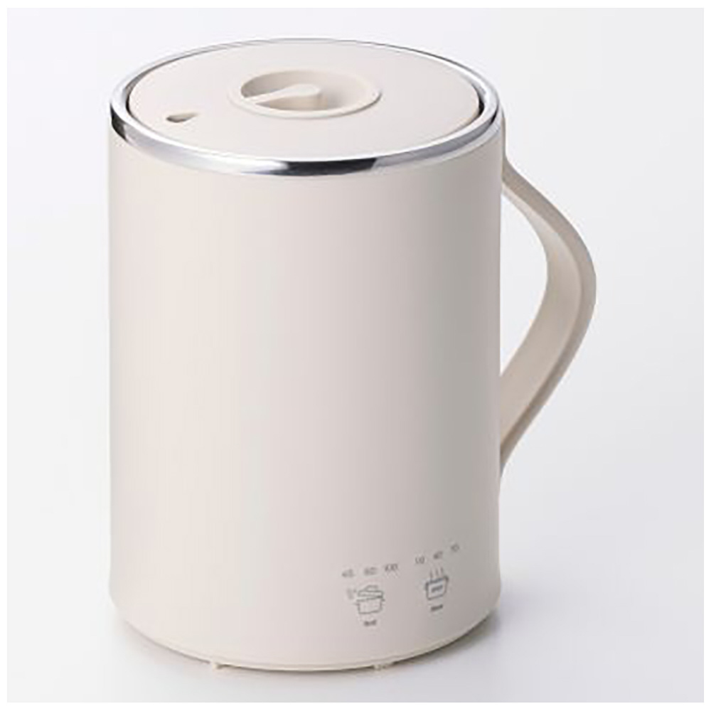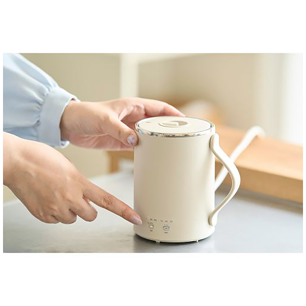 ■電源:AC100V、50Hz/60Hz ■定格消費電力:275W ■サイズ:幅約128mm(取っ手含む)×高さ約130mm ※カップ直径約94mm ■質量:約440g(電源コード含む) ■容量:Boil:350ml、Stew:300ml ■カラー:ベージュ ■電源コード長:約1.5m ■保証期間:1年間 ■付属品:ふた、電源コード ■機能:沸かす:Boilモード、煮込む:Stewモード ■安全装置:サーモスタット、温度ヒューズ(216℃)