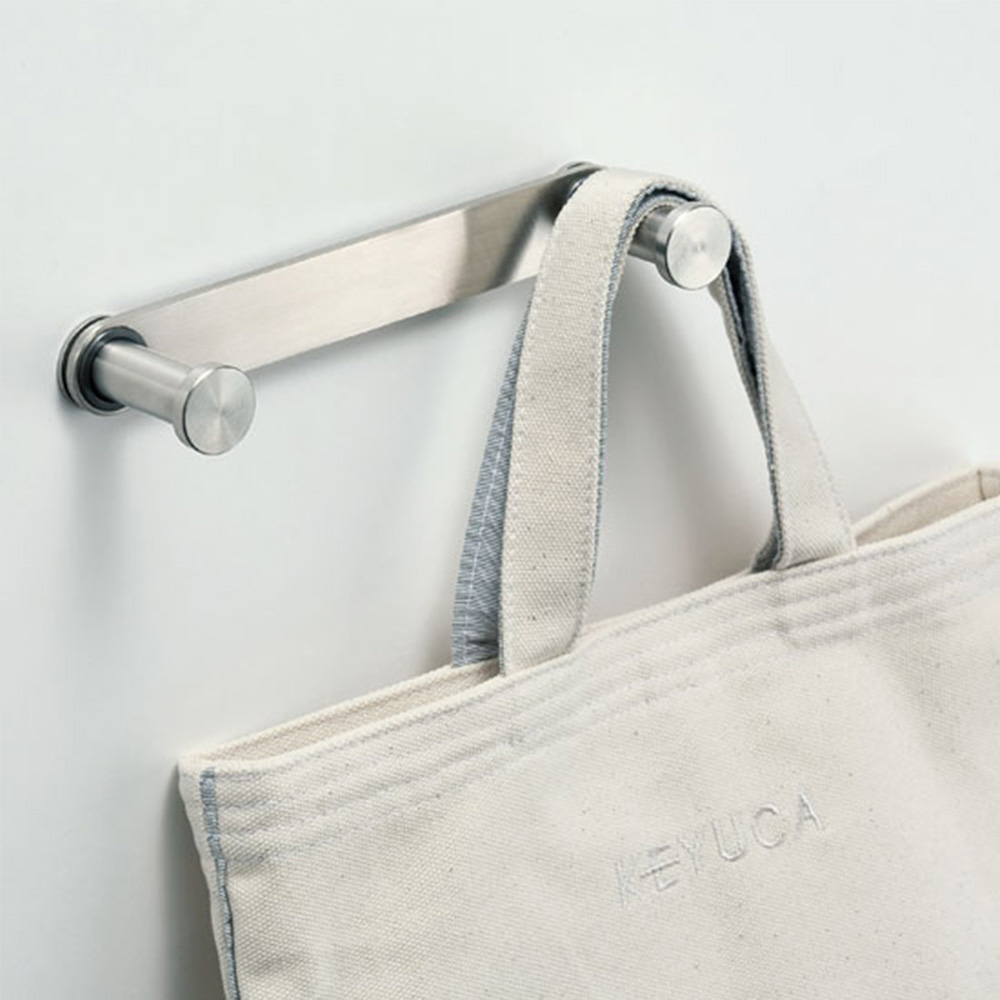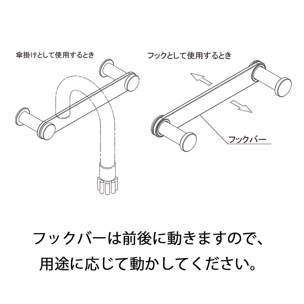 プレート部が前後に可動し、手前にすると傘掛け、押し下げるとフックにもなりショッピングバック等をかけられます。