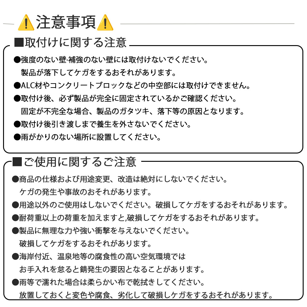 ●取付け後、必ず製品が完全に固定されているかご確認ください。固定が不完全な場合、製品のガタツキ、落下等の原因となります。