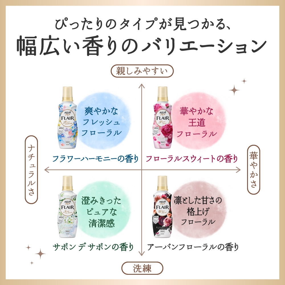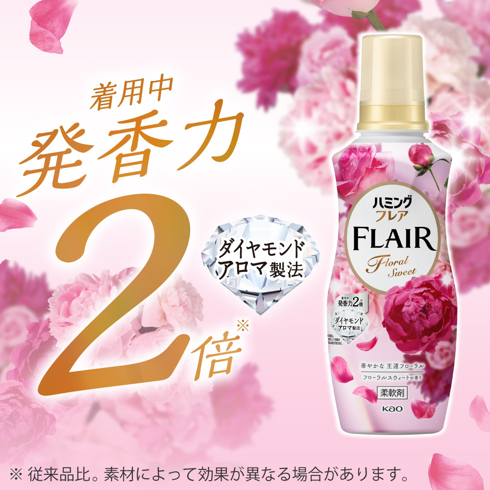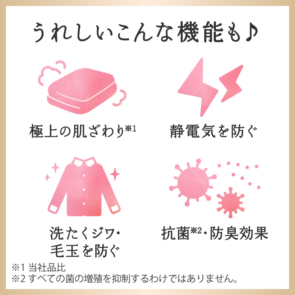 着用中発香力2倍*1。最高級*2アロマバランスで美しい香り続くダイヤモンドアロマ製法。フローラルスウィートの香り。香り12時間続く。極上の肌ざわり*3。シワ、毛玉、静電気を防ぐ。抗菌*4防臭効果。*1従来品比、素材によって効果が異なる場合があります。*2当社柔軟剤内。*3当社品比。*4すべての菌の増殖を抑制するわけではありません。