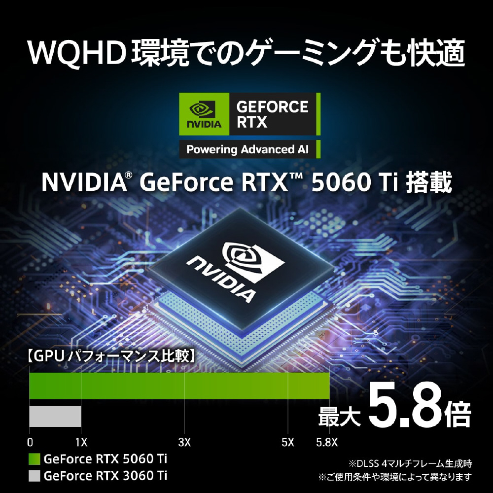 高性能CPUとRTX 5060 Ti 16GB搭載した高性能ゲーミングPC。フルHDからWQHD解像度へのステップアップにお勧めで、配信やAI処理にも対応し、RGBライティングやWi-Fi 6Eなど便利機能も充実。