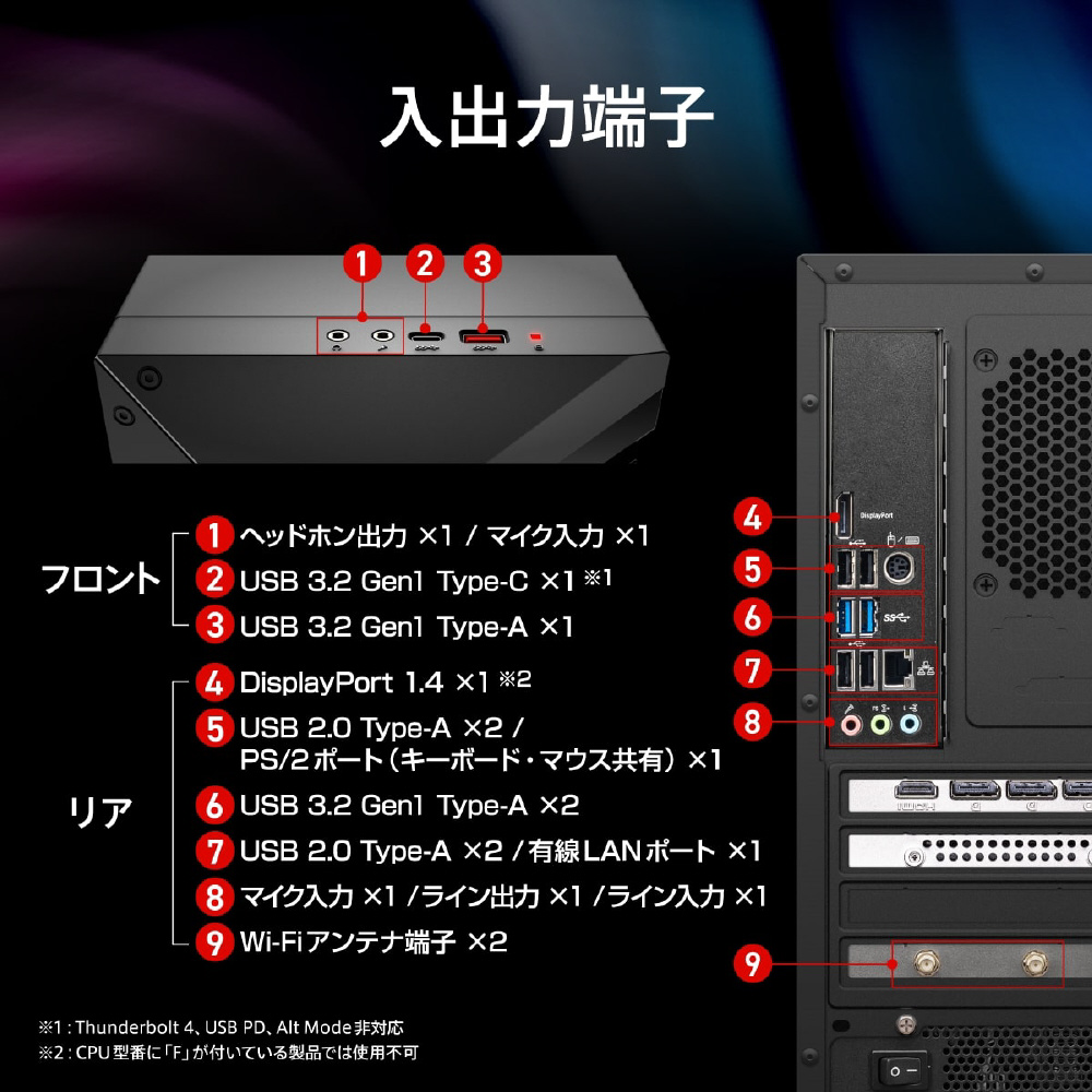 [リア] USB 3.2 Gen1 Type-A ×2 USB 2.0 Type-A ×4 PS/2ポート(キーボード・マウス共用) ×1 DisplayPort 1.4 ×1 ※1 Wi-Fiアンテナ端子 ×2 有線LANポート ×1 ライン出力 ×1 ライン入力 ×1 マイク入力 ×1