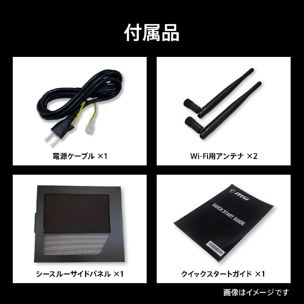 電源ケーブル ×1、Wi-Fi用アンテナ ×2、シースルーサイドパネル ×1、クイックスタートガイド ×1