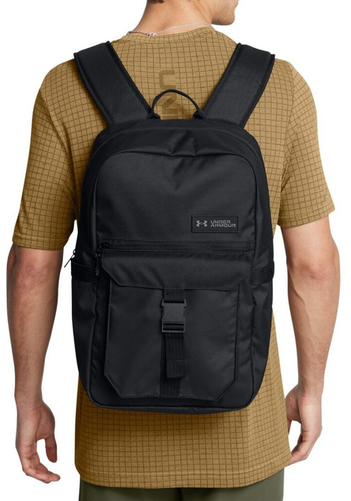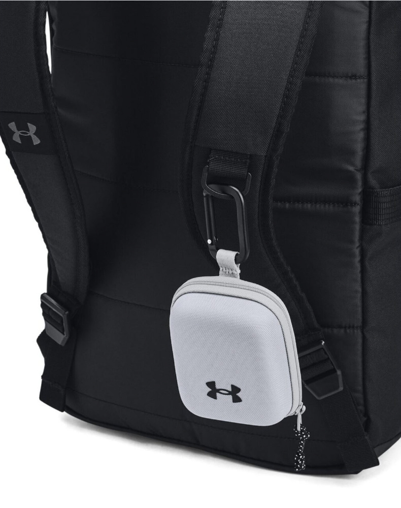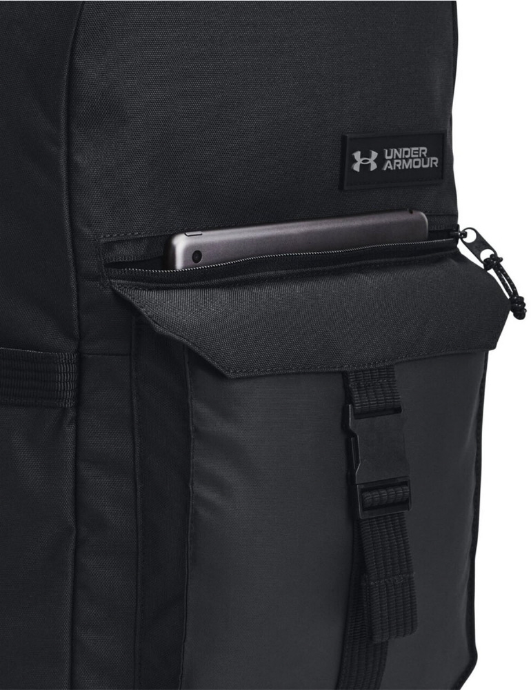 前面にバックルで開け閉めできる小物用の収納スペースを配置。