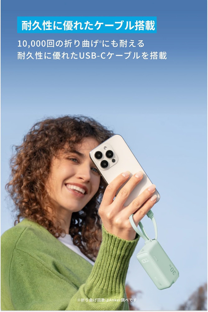 モバイルバッテリー Power Bank (30W Fusion Built-In USB-C ケーブル) ブルー A1636N33 [USB Power Delivery対応 /2ポート]