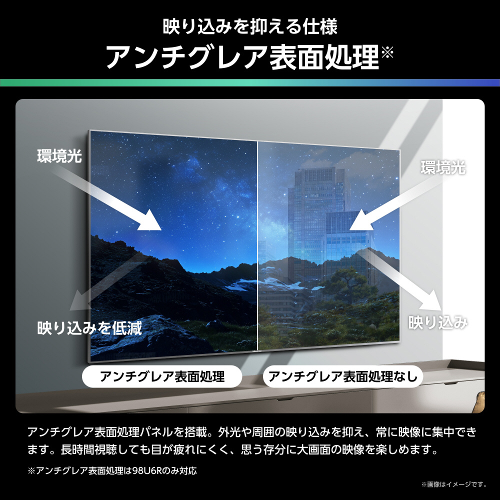 ●映り込まない「アンチグレア」仕様。目にやさしい大画面「アンチグレア表面処理」(98v型のみ)