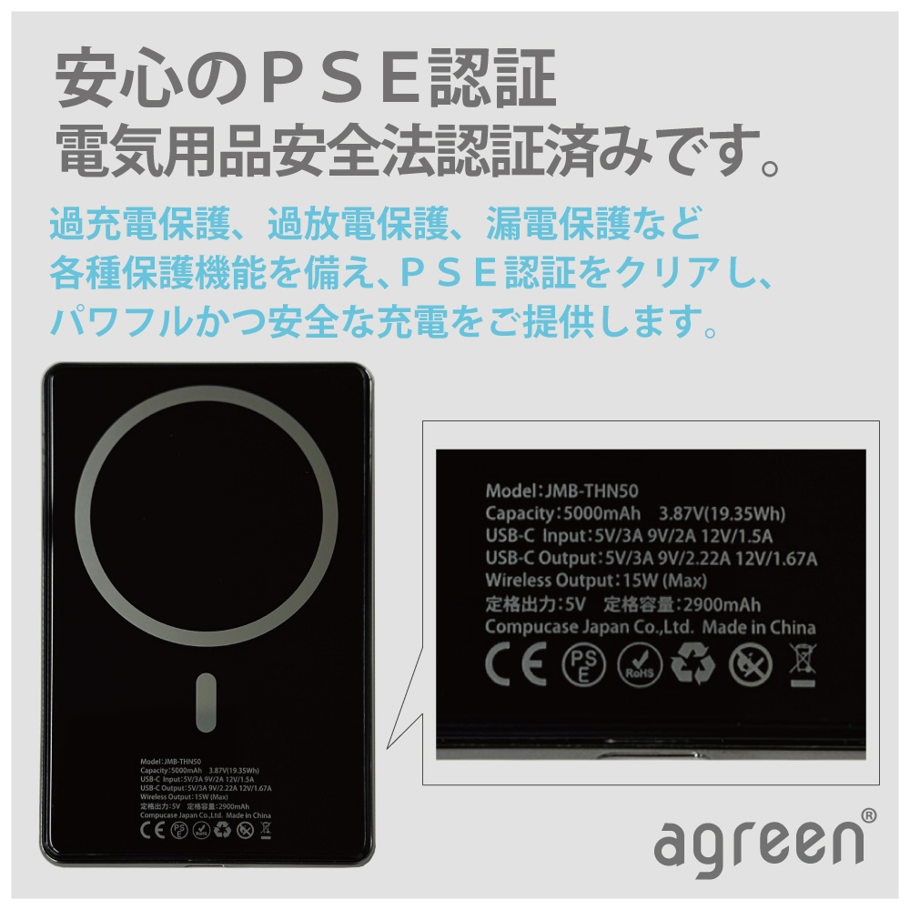 Magsafe対応薄型モバイルバッテリー 5000mAh 超極薄 agreen パープル JMB-THN50-PP
