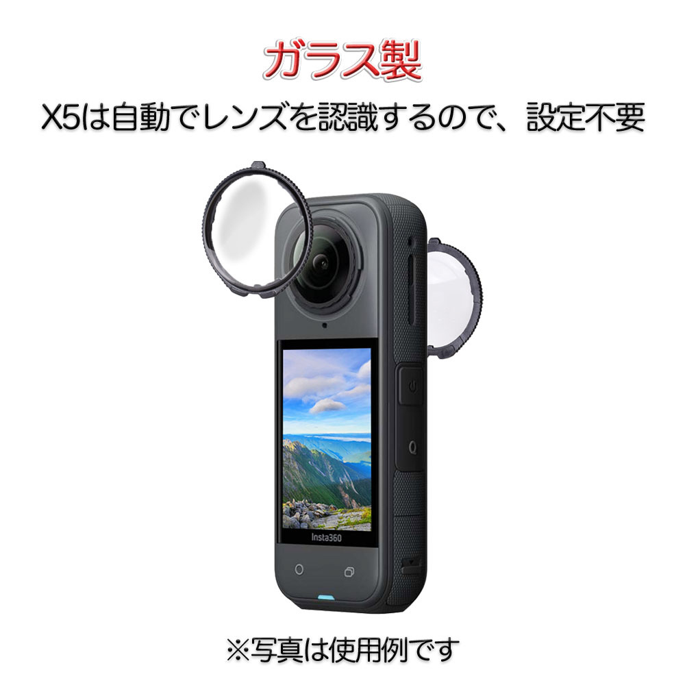 Insta360 X5専用のガラス製レンズカバー。砂や衝撃からレンズを守り、自動モード切替対応で手間なく撮影開始。ツイストロック式で着脱も簡単です。