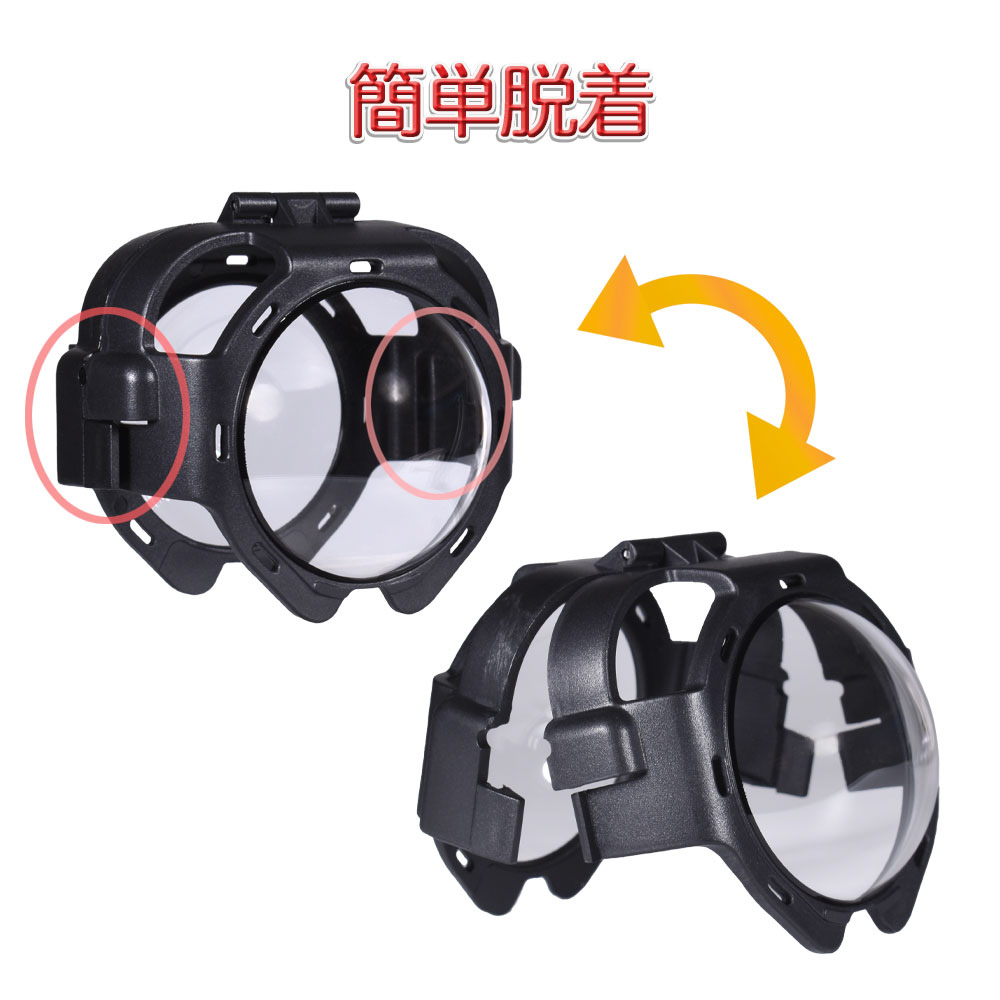 ワンタッチで着脱できるスナップ式を採用。さらに通気口付きで熱こもりやレンズの曇りを防ぎます。