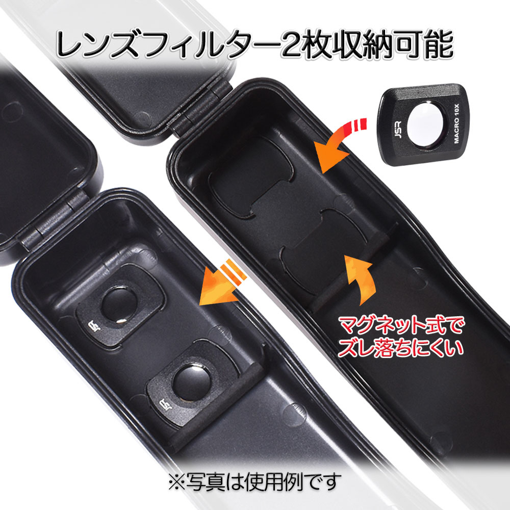 ケース内にマグネット固定式の専用スペースを設け、レンズフィルターを2枚まで安全に収納できます。