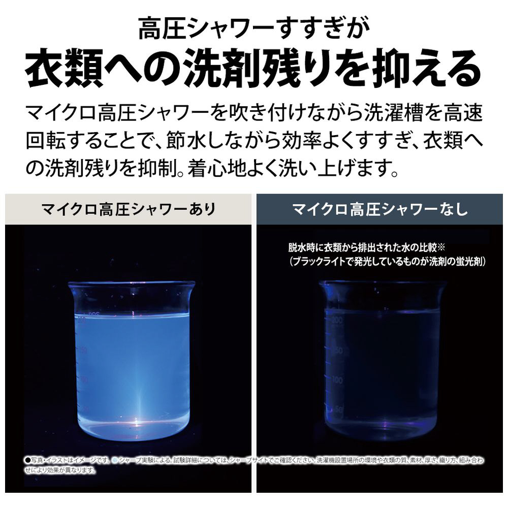 清潔な水道水を毎秒100万個以上の微細な水滴にして、高圧シャワーノズルから衣類に噴射。微細な水滴なので、衣類の傷みを抑えながら、ガンコな汚れを弾き飛ばします。