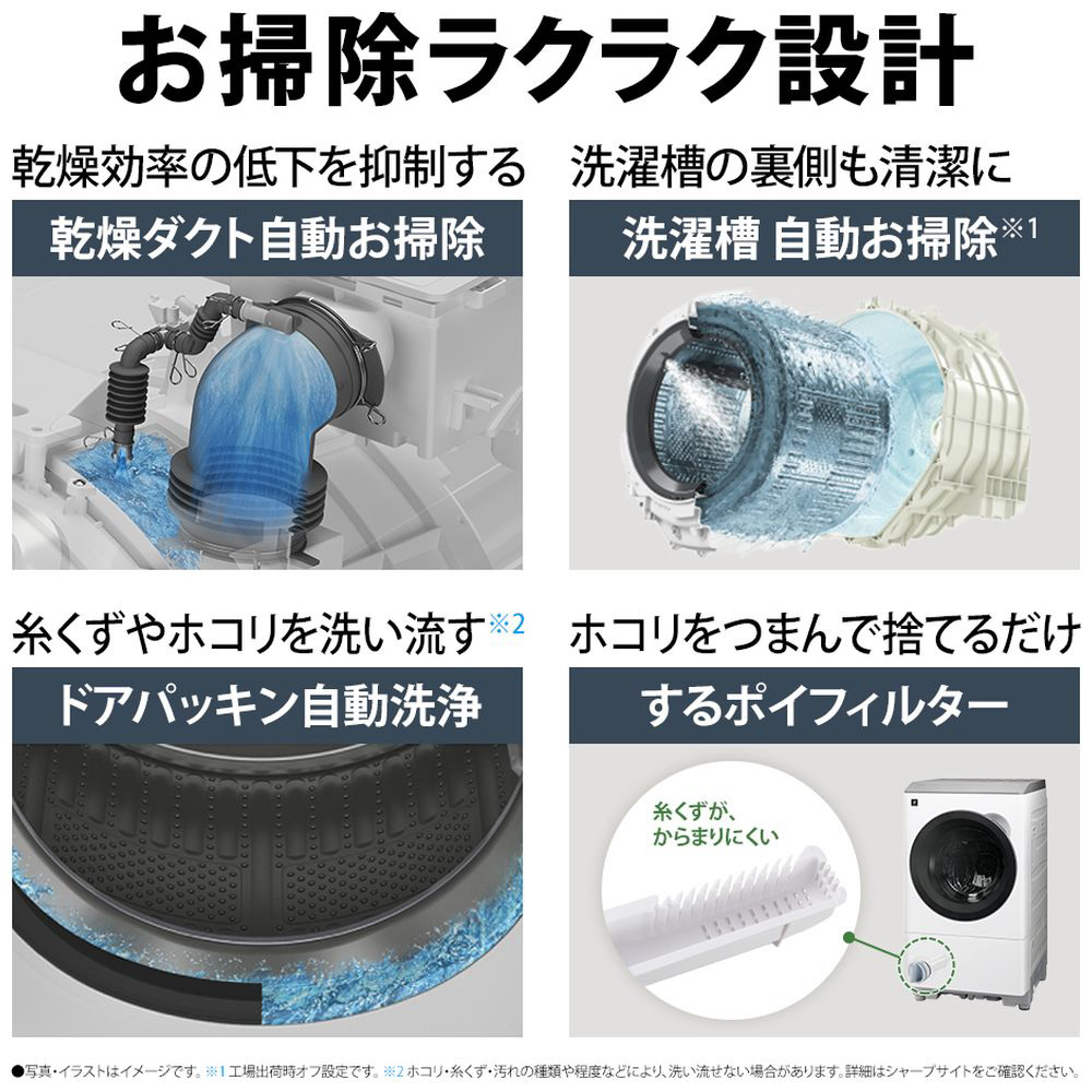 乾燥ダクト、洗濯槽、ドアパッキンなど、気になる部分を洗濯機が自動でお掃除します。