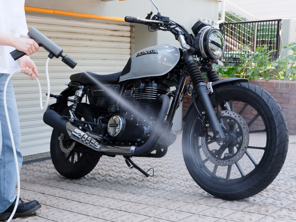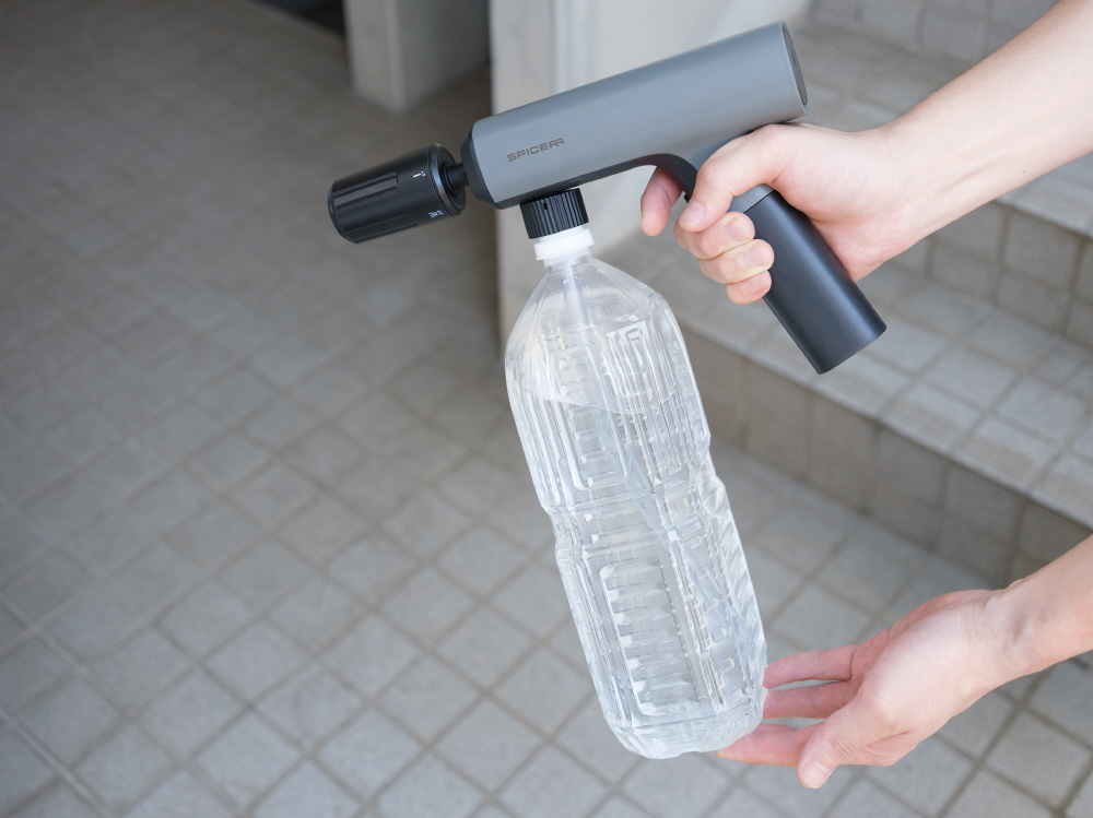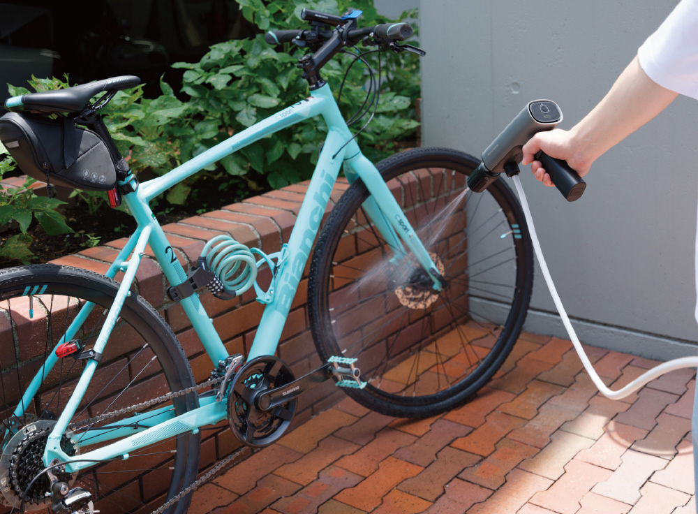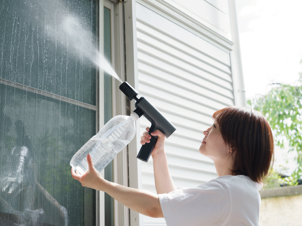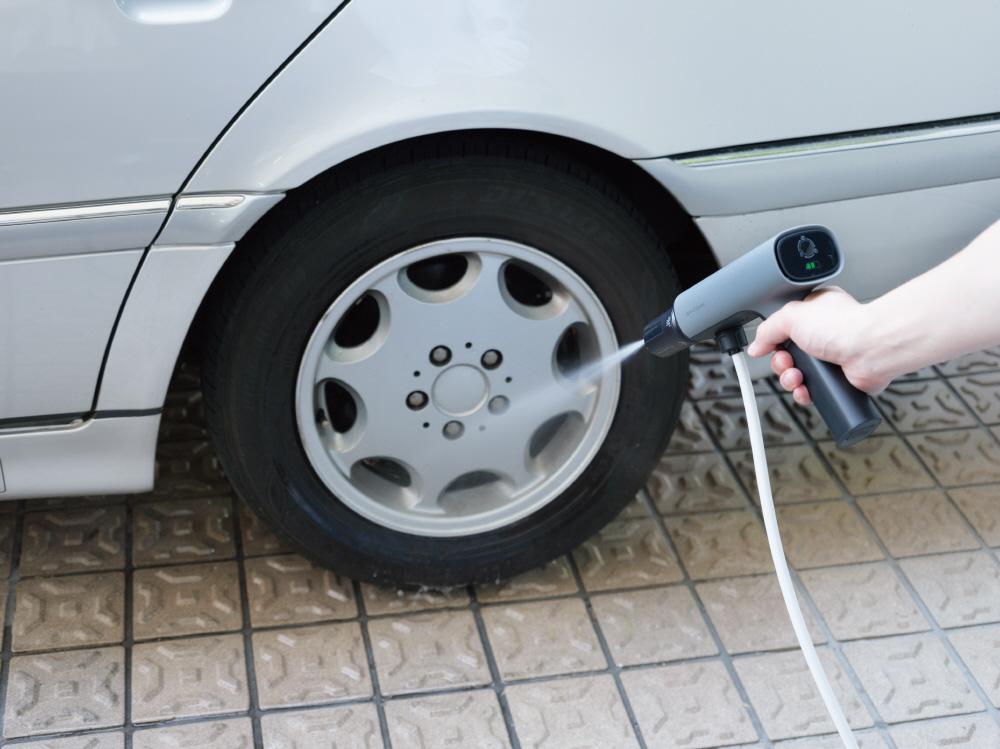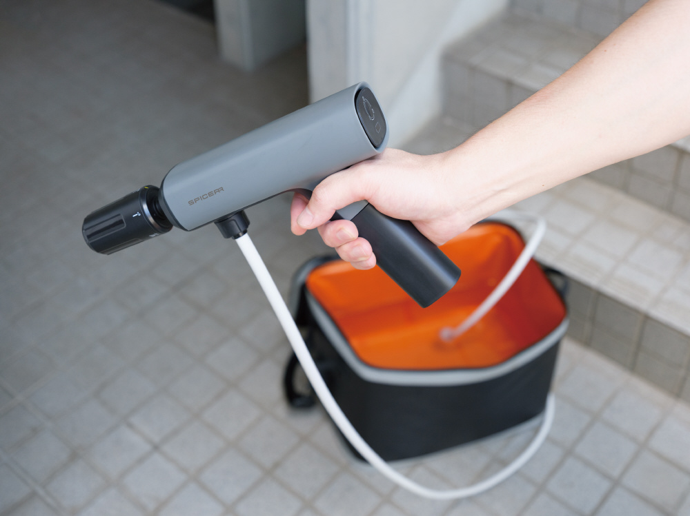 充電式でコンセントとケーブルの長さなどを気にせず使用することができ、バケツからホースまたはペットボトルを装着することで水栓いらず。場所を選ばない洗浄が可能です。