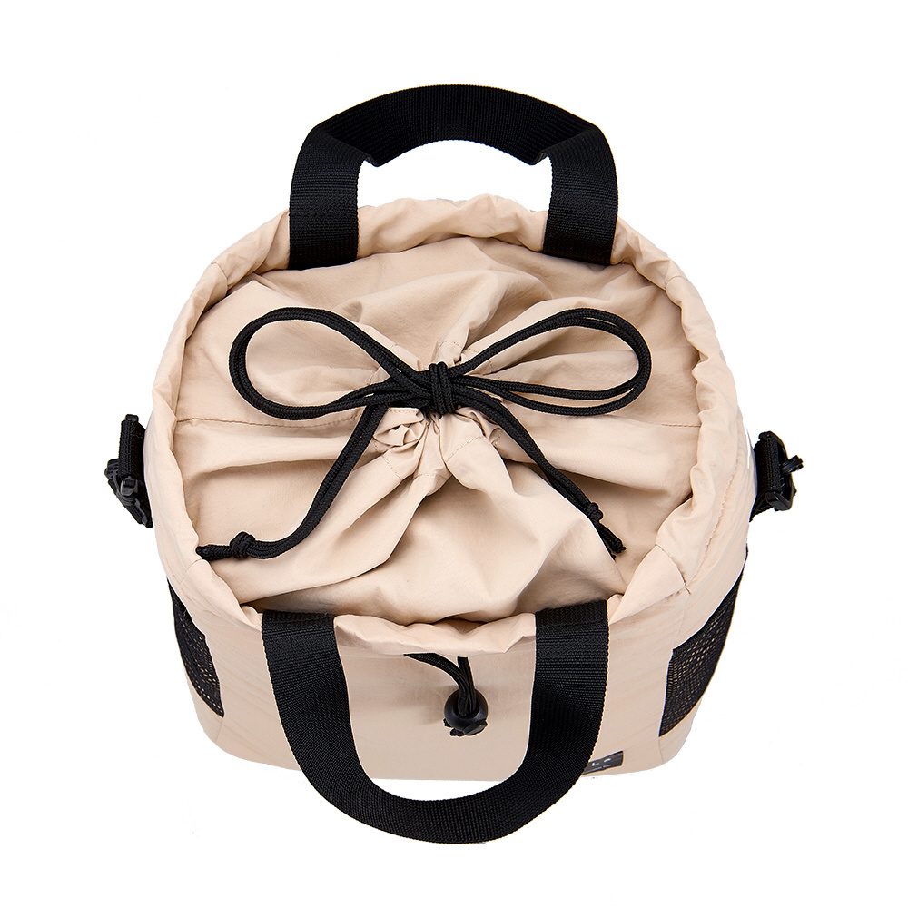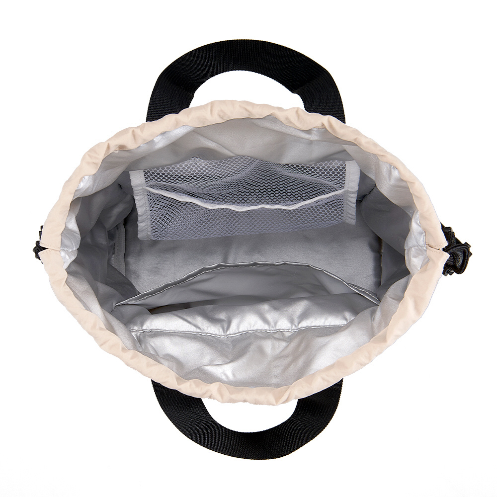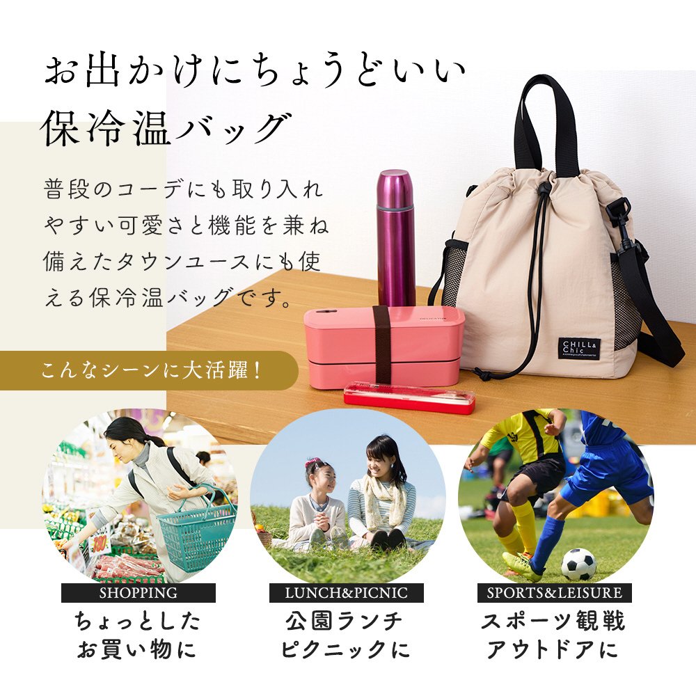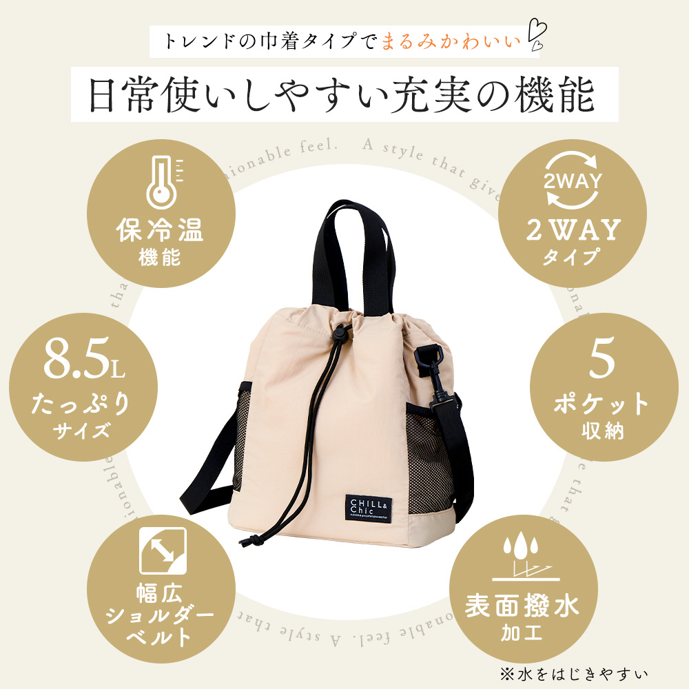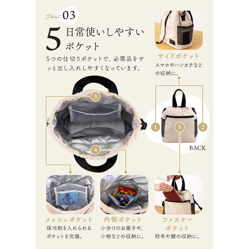 2段階の巾着仕様でしっかり密封するため、冷気や熱気を逃がしにくく、食材やお弁当、飲み物の保冷・保温効果が長持ちします。