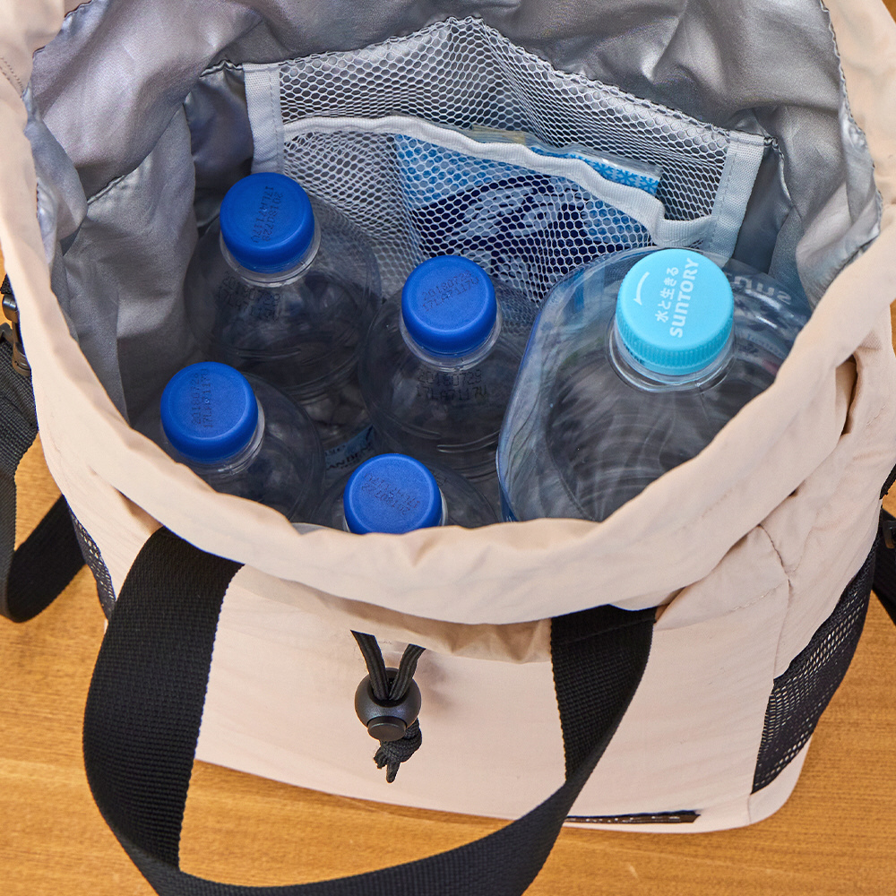 2Lペットボトル1本と500mlペットボトル4本が縦に入るほどの容量で、お買い物バッグとしても活躍します。