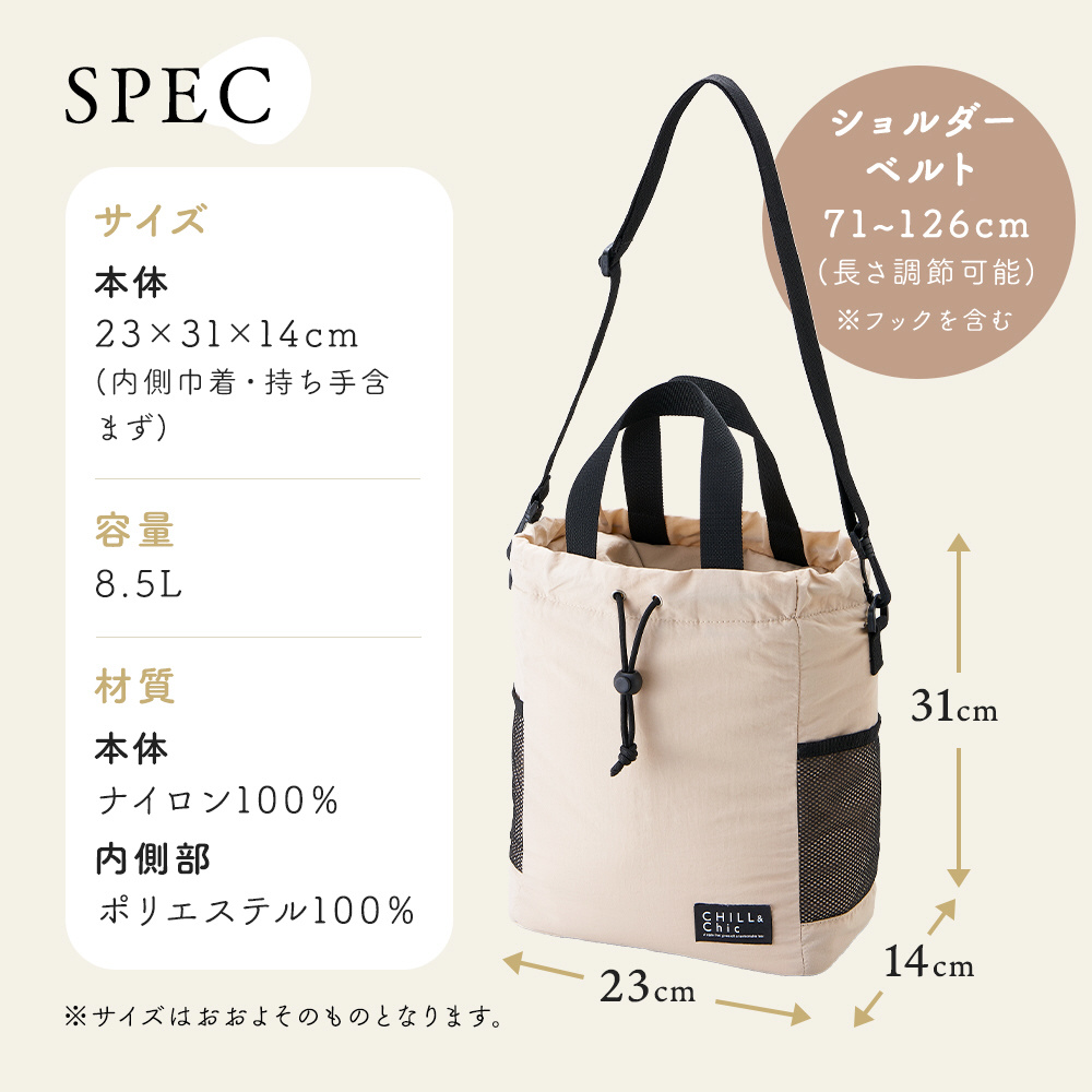 仕様1 サイズ : 本体(約)23×31×14cm(内側巾着・持ち手含まず)、ショルダーベルト(約)71cm~126cm(フック含む、長さ調節可能)